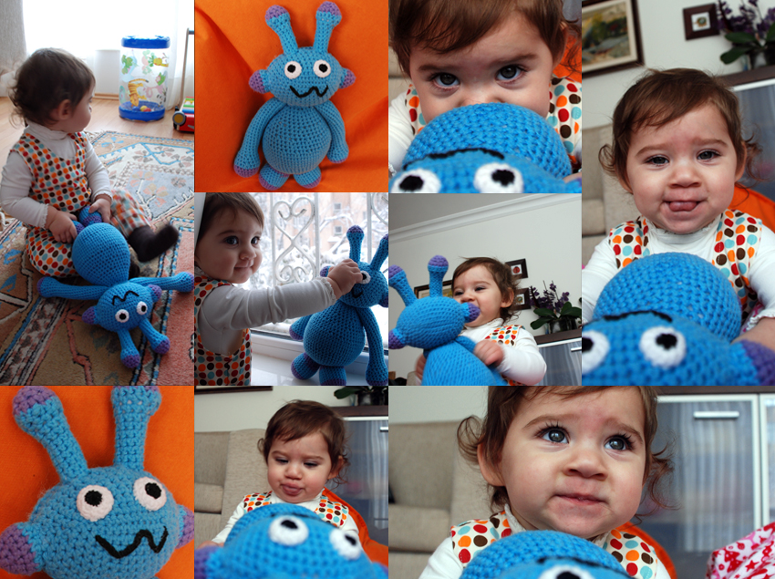 Yukarıdaki resimde gördüğünüz uzaylıyı geçen sene bu zamanlarda, Mira’cım karnımdayken, Baha ile Özge’nin evinde örmüştüm. Hamileliğin son aylarında tam hacıyatmaza dönüşünce… durup durup kendimi hep online alışveriş sitelerini gezerken bulunca… çocuklar ve bebekler için satılan tasarım ürünlerden ve fiyatlarından gözlerimi alamayınca… aldım elime bir tığ ve bir yumak ip… Garip görünüşlü modern oyuncaklar moda diye… ben de dedim; bir uzaylı öreyim. Hem daha acayip bir şey çıkarsa da, neye benzerdiğine ilişkin bir açıklama yapmama gerek kalmayacaktır diye düşündüm. Ne yapıyorsun diyenlere de uzaylı dedim geçtim… Baha ile Özge burada olunca, o günler geldi aklıma… Uzaylımızı da görün istedim.