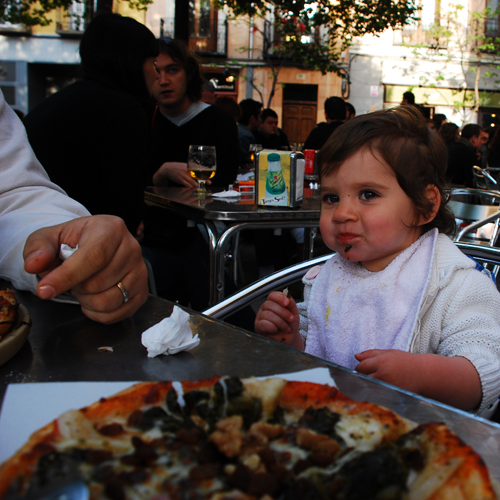 Yemek konusuna gelince… Mira için seçeneklerde hiç zorlanmadık. Sadece gittiğimiz çoğu yerde ingilizce menü olmayınca balık (pez), yeşil (verde) gibi bir kaç anahtar kelime bizim için hayat kurtarıcı oldu. Sebzeli balıklı İspanyol pilavı; Paella… Patatesli omlet yani Tortilla Espanola… ve özellikle de deniz mahsüllü İspanyol mezeleri (Tapas) Mira’cımın favorileri idi… Hepi topu 6 dişi ile yemediği nane kalmadı…