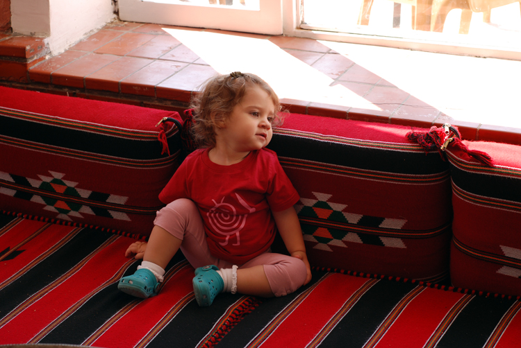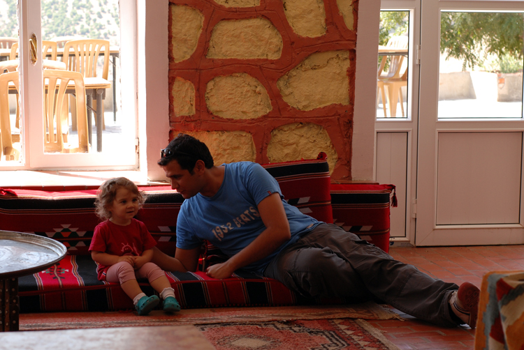 Gün batımına doğru hızını arttıran rüzgar karşısında; zekice bir karar ile getirdiğimiz tüm kalın kıyafetleri ağırlık etmesin (!) diye arabada bıraktığımızı farkedip, tıpış tıpış aşağı indik. Aşağıdaki kahvenin terasında sıcak çay ile günü batırırdık. Bu arada ekibin inişini beklerken Mira’ya - aslından kendimin otlanacağı - bir çökelekli gözleme söyledim. Mira daha önümüze koulması ile atladı… Üfleye üfleye bir parça yedi… Bitirdikten 15 saniye sonra, elini ağzına sokup “acı, acı” diye seslenmeye başladı. Mira’cığıma “yok canım acı değil sıcaktı sadece…” falan derken bir parça da ben yedim… ve anladım ki gözleme gerçekten acı… sonradan sonradan bastırıyor… Bu seyahat süresince bir çok yemeğin acı olabileceği aklıma gelmediği için Mira’cımın acı ile tanışıklığını oldukça arttırdım. İşin ilginç tarafı Mira’nın bunlardan bir çoğunu keyifle yiyor olmasıydı… Hamileyken o kadar acılı ekşili aşermemde varmış bir keramet…