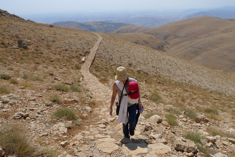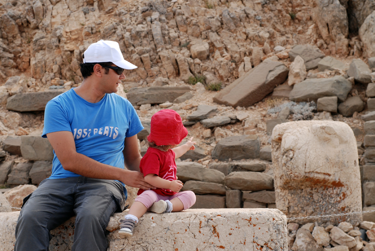 Havaalanından önce Kahta’ya, oradan da Karadut’a doğru gittik. Gece Karadut’ta kalacağımız Euphrat Otel‘de kahvaltımsı öğle yemeği ile kısa bir mola verdik. ve tekrar yola düştük. Nemrut Milli Parkına Karadut kapısından girdik. Tümülüs’ün bulunduğu tepenin eteklerine kadar araç ile ulaştık. Sonrasında mecbur yaya devam ettik yola… Batı terasına çıkan tören yolunu kucağımda 11 kiloluk Mira ile ancak 40 dakikada çıkmayı başardım. Bu tırmanış ile 1,5 senedir Mira’yı kaldır, indir dışında bir egzersiz yapmamamın cezasını iyice çektim. İşim iyi tarafı bu seyahatte sürekli omuzumda - kucağımda Mira ile keçi gibi tırmanmak durumunda kalınca hımbıllığımı biraz olsun attım üstümden… Döndüğümde hımbılığım yanında bir de 3 kilo gittiğini görünce ne sevindim ne sevindim anlatamam. hoş şu an o giden 3 kilo aynen geri alınmış durumunda… olsun bir kere giden tekrar gider