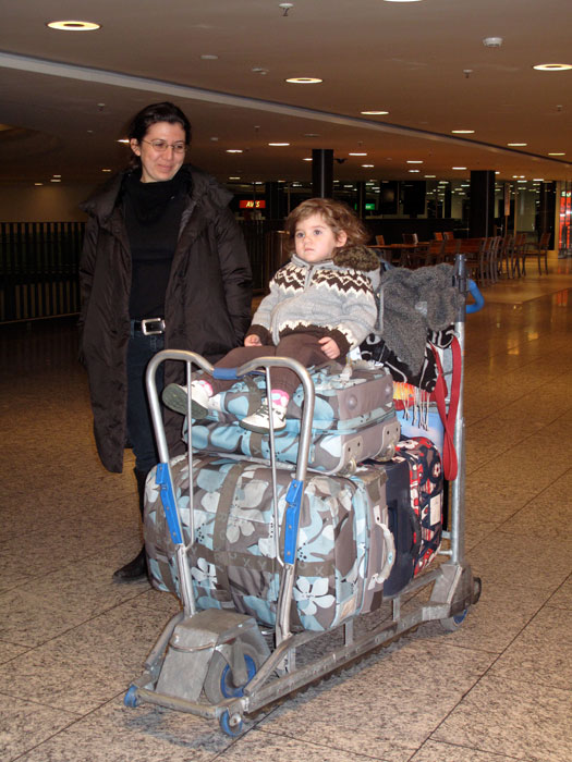 Dönüşümüz zamanlama açısından gidişten beterdi. - nasıl bu saatlere bilet aldın diye sormayın tamamen benim dışında gelişti - Mira’ya akşam yatarken, uyandığında havaalanında olacağını, oradan uçağa bineceğimizi, eve, oyuncaklarına, Canberk’e gideceğimizi tekrarlaya tekrarlaya anlattık. Zürih’ten uçağımız sabah 7de kalktığı için gecenin 2sinde ayrıldık St. Christoph’tan… Mira’yı uyandırmadan giydirdik, indirdik arabaya… Gözünü açtığında Zürih’teydi. Şu son fotoğraf anın yakalanamadığı bir foto olmuş ama zaten tüm seyahat boyunca 5-10 fotoğraf çekmişiz ya bu da boşa gitmesin diye ekledim. İşin aslı sabah 5te herkes balık gibi bakarken o bagaj arabasının üzerinde dans ediyordu ya hiç yakalayamamışız.