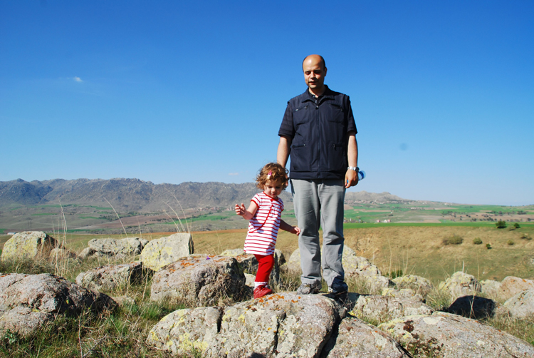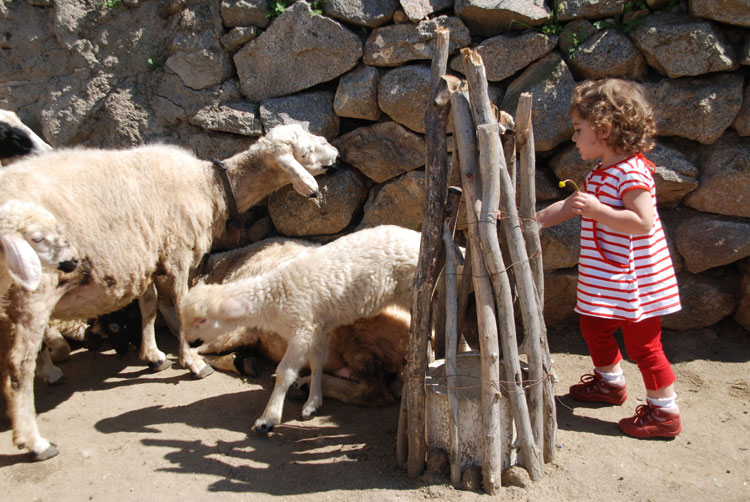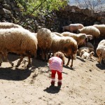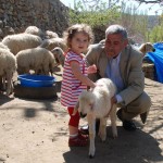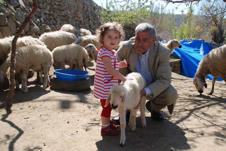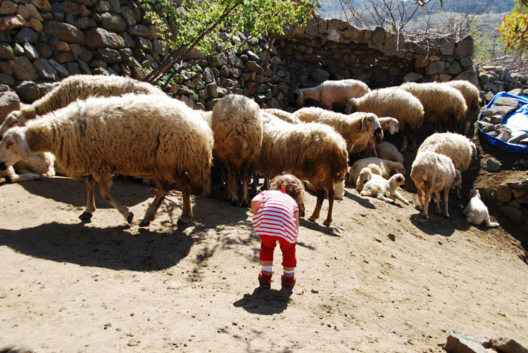 Bu sahne o kadar tanıdık ki.. iki hafta önce eşim ısrarla “Doğu’yu kuzulara götürücem, kuzu gördüm ben onu kuzuya götürücem..”diyerek yakınlarda kuzulu bir köy buldu (Çokören köyü) aldı Doğu’yu kuzularla buluşturdu.. Doğu çok mutluydu; sadece terliklerinin üstünde ve kitabında resmini gördüğü kuzu hem meeliyor hem de kendisine doğru zıplıyordu..(Doğu kendisinden daha hareketli bir canlı görmenin şaşkınlığıyla bir süre dondu kaldı ama sonra kuzuyla aralarındaki ortak noktaları -ikisinin de kuzu olması- keşfedince o da zıpıldamaya başladı..Gerçi çoban arkadaş “abi koyde bizim bebeler bunnarla güleş tutyo sizinki pek yanaşmadı” dediyse de ilk buluşma için hiç de fena diildi..”) Günsonunda çobanla sarılıp öpüşüp ayrılırken cep telefonları karşılıklı alındıktan sonra felsefi yönü kuvvetli çobanımız Uğur çok doğru birşey söyledi; “abi işe bak; siz köye gelmeye çalışıyonuz, bizse şeere varmaya çalışıyoz..”