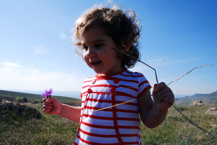 Böylece geçen Cumartesi günü kuzu almayı bahane ederek köyümüzün yolunu tuttuk. Mira bol bol kuzu sevdi. Tavuk kovaladı. Köpekler ile oynadı. Çiçek topladı. Ot yoldu. Atladı. Zıpladı. Koşturdu. Hani arpası fazla gelmiş derler ya… Bizimkine de oksijen fazla geldi galiba… Dönüş yolunda uyur diye beklerken hiç uyumadığı gibi bir de cırcır böceği gibi anlattı durdu.